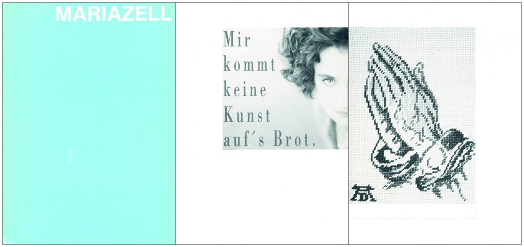 Umschlag- und Seiten-Abbildung: »MARIAZELL« Booklet, 1990 (SKI), 14,7x20,5cm, 32 Seiten, Auflage 1.000 Exemplare, Idee und Konzept: Joachim Baur; mit Beiträgen von: Helga Konrad, Albrecht Dürer, Votivbildsammlung Basilika Mariazell (Anonym), Robert Adrian X, Peter Gerwin Hoffmann, Joachim Baur, Henri Pierre Jeudy, Karol Pichler, Heimo Ranzenbacher, Walter Titz, Piero Manzoni, Timm Ulrichs, Josef Klammer, Otmar Klammer, Superior Pater Veremund, Saatchi + Saatchi Wien, u.a.
